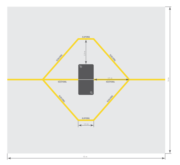 - A játékteret tisztán látható vonalak jelzik, melyek minimum 50 mm szélesek, és a színük különbözik a pálya borításától.